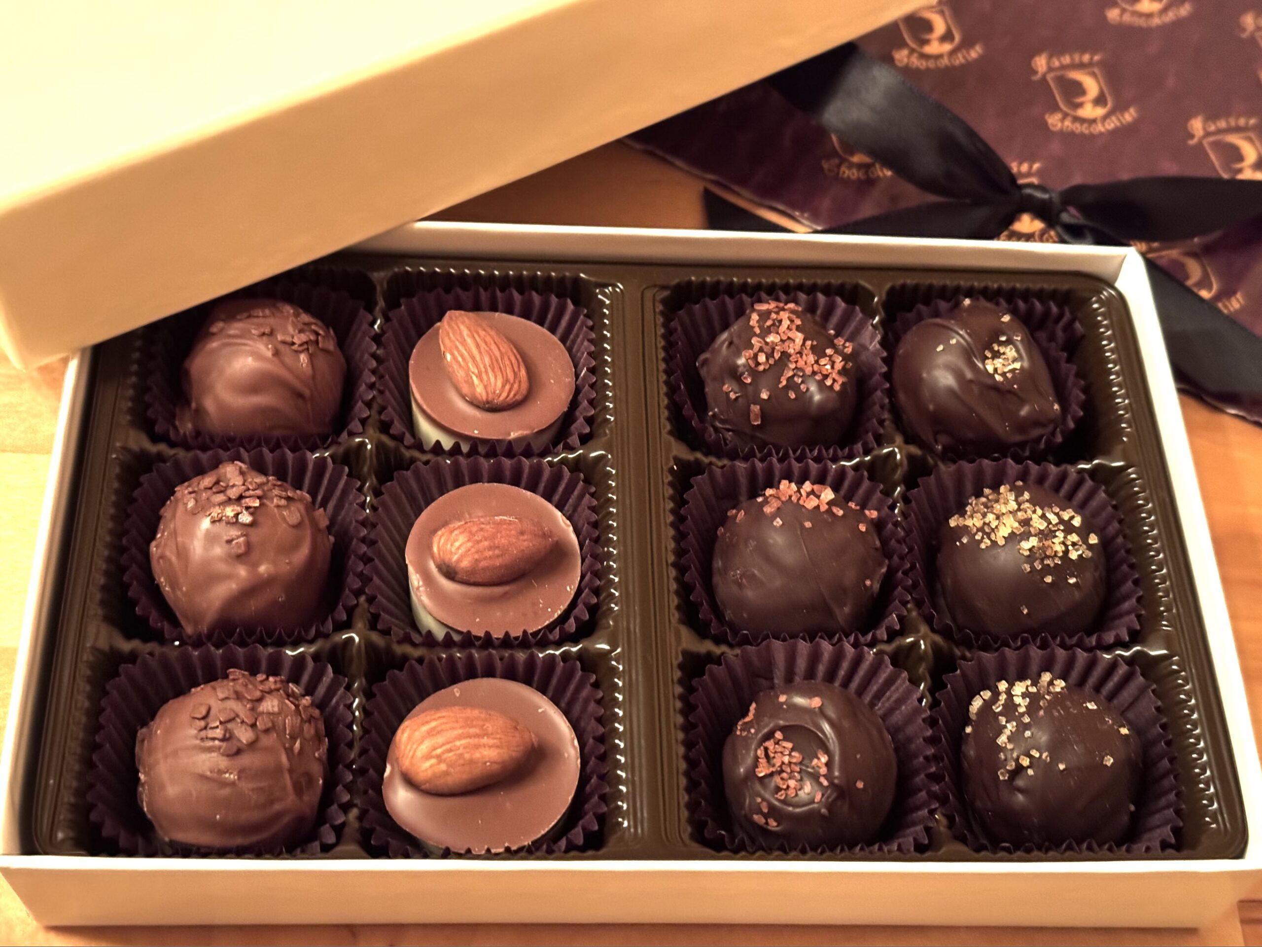 An elegant box of 12 chocolate truffles made by Hauser Chocolatier for Wight’s. Includes 3 each of the following truffles, selected for their ability to bring out the flavors in Bourbon and other other whiskies.