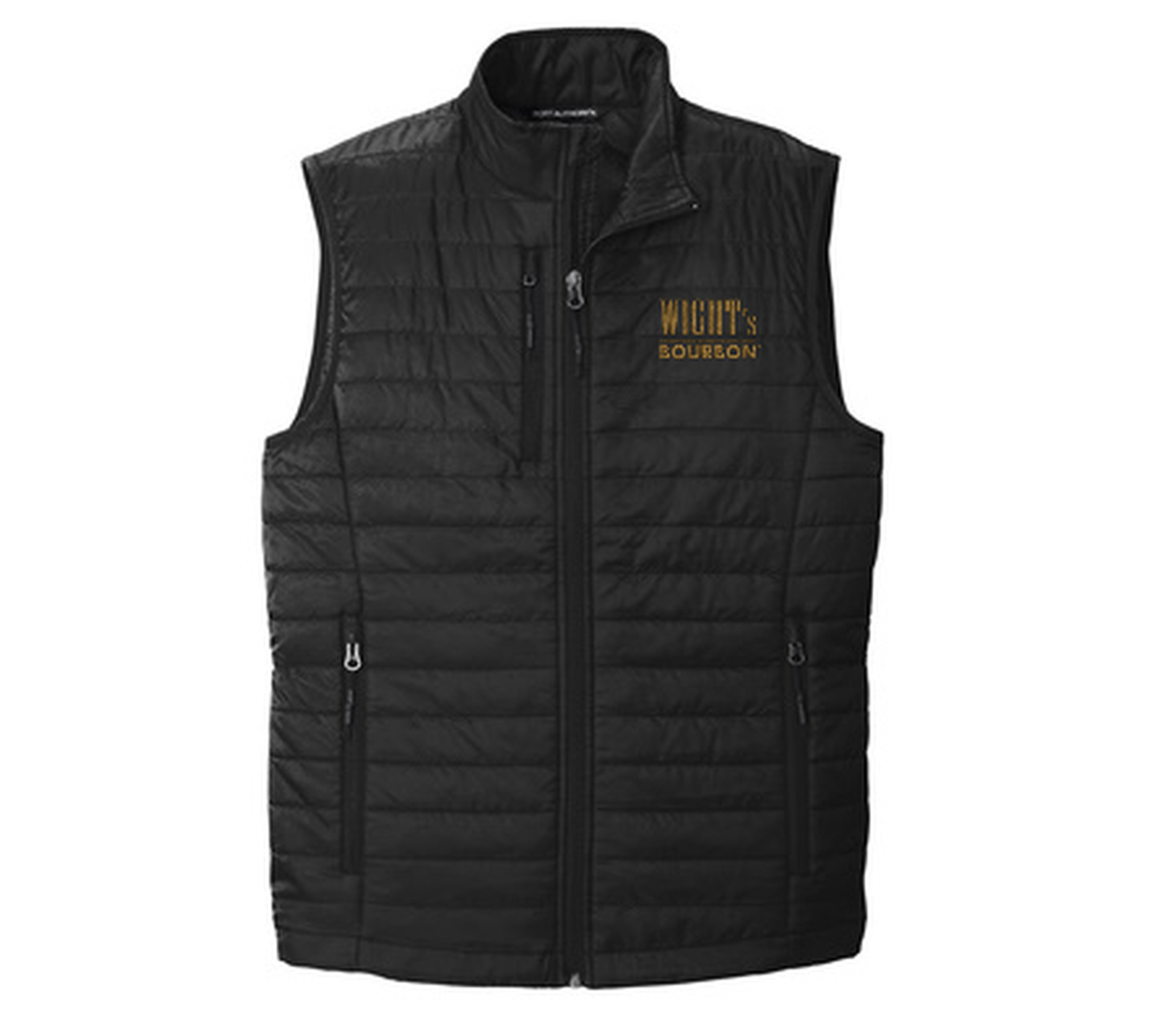 The Wight’s Bourbon Orvis-style Quilted vest is perfect for chilly days. In black with gold logo.
